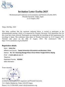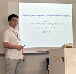 8月21日-23日,第8届计量经济学与统计学国际会议(International Conference on Econometrics and Statistics, EcoSta 2025)由日本东京早稻田大学主办。首都经济贸易大学统计与数据科学学院副教授邹家辉受邀参会,在专题分会场“Model averaging and sequential algorithms”中担任主持人,并作了题为“Improving tensor regression by optimal model averaging”的学术报告。